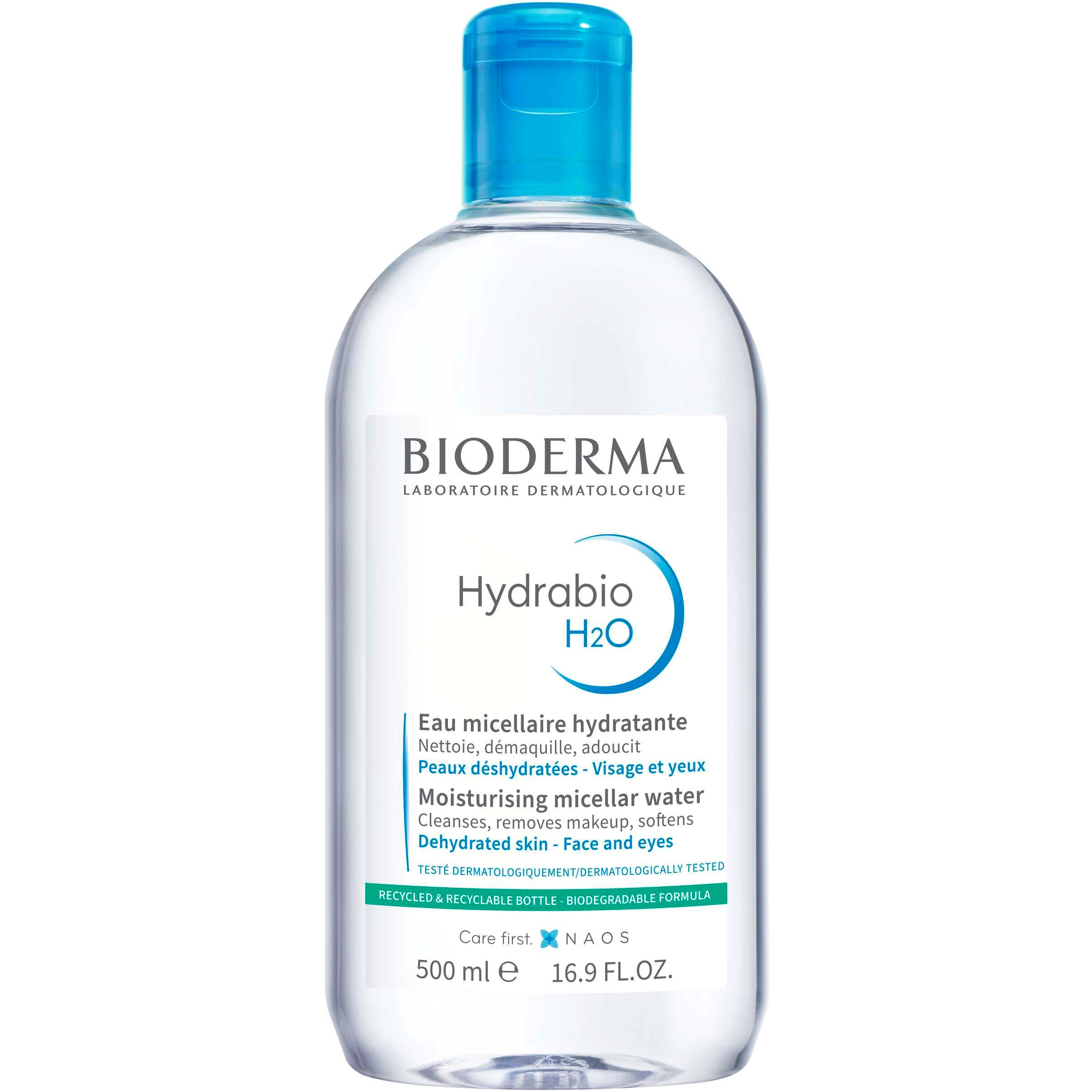 Bioderma Hydrabio H2O 500 ml Dermatologisk micellevand til dehydreret, tør og sensitiv hud. Renser huden, fjerner makeup og virker fugtgivende samt beroligende.Efterlader huden blød og