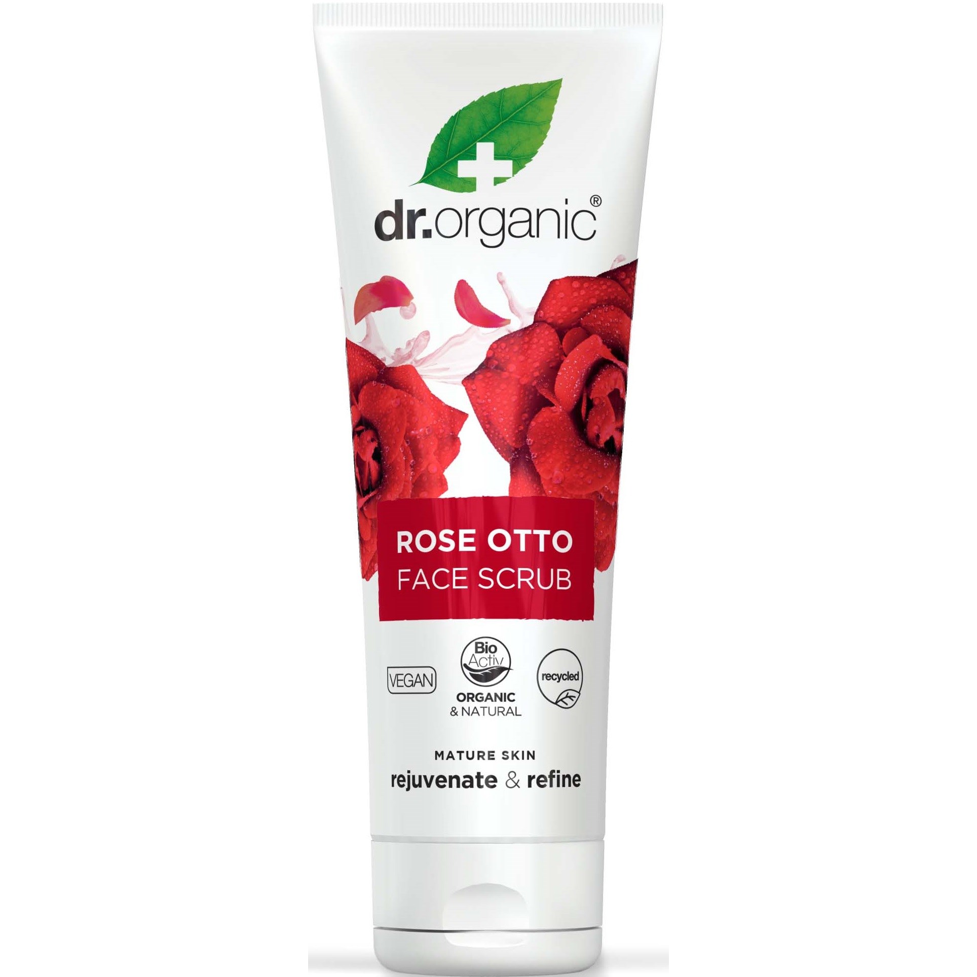 Dr. Organic Rose Otto Face Scrub 125 ml En lækker ansigtsscrub med økologisk rosenolie, rosenvand, aloe vera, bivoks, abrikoskerneolie og kamille.Anvendelse:Påfør scrubben i hele ansigtet.